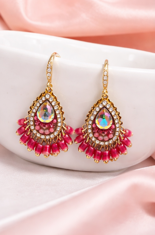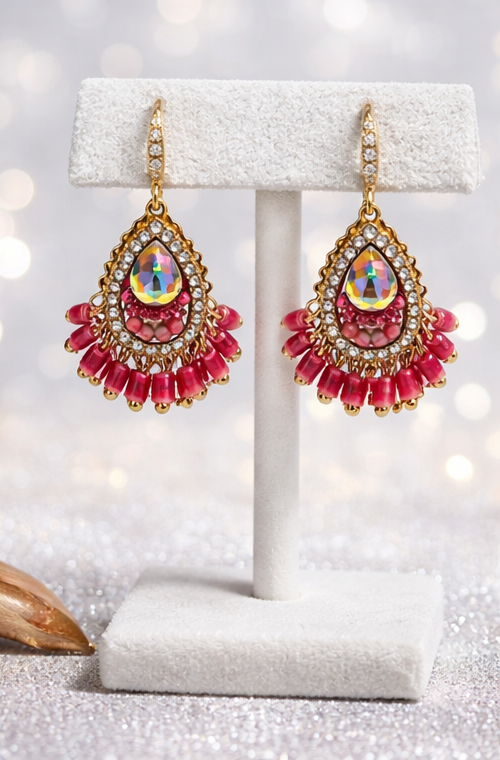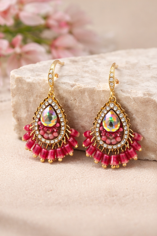 Opulent teardrop earrings adorned with intricate stone detailing and rich ruby accents, designed to add regal elegance to festive and evening looks.