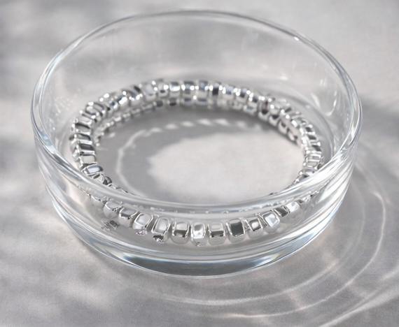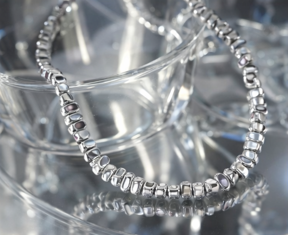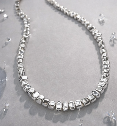 A sleek silver-tone beaded necklace featuring polished metallic beads arranged in a soft curve for a refined, contemporary statement.