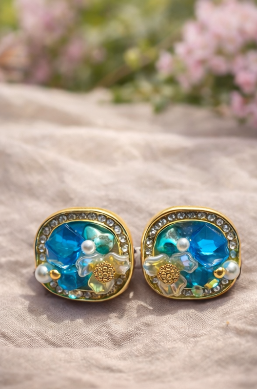 Royal Ice Studs are luxe round crystal stud earrings featuring an icy centerpiece with delicate gold detailing, inspired by regal elegance and oceanic sparkle.