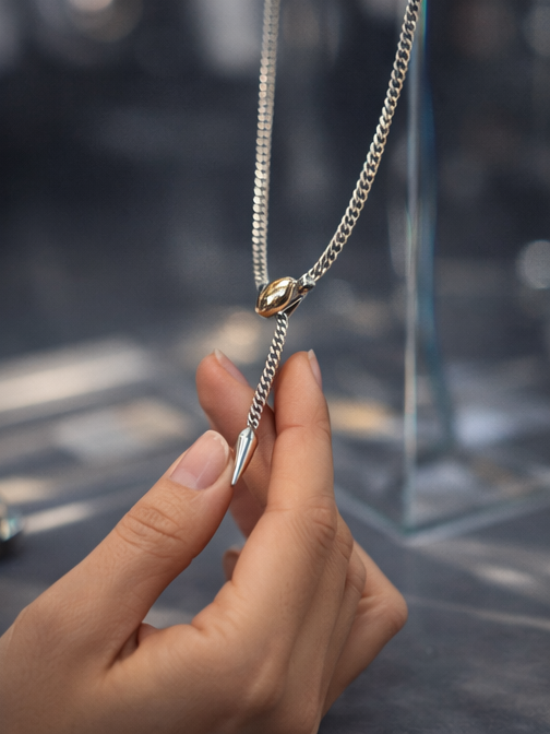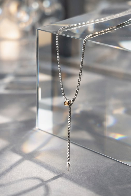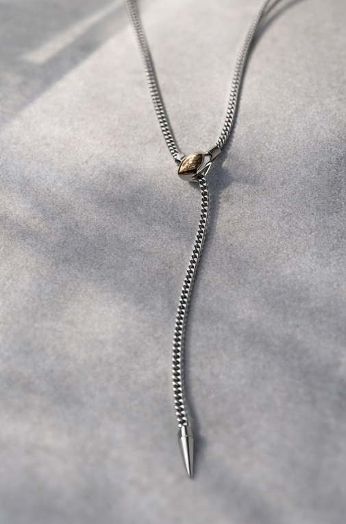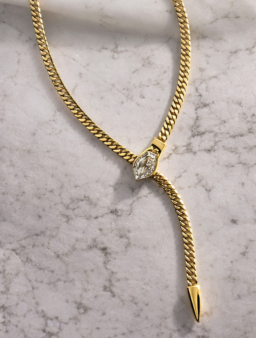 A sculptural gold-tone lariat necklace with a fluid drop silhouette, designed to elongate the neckline with modern elegance.